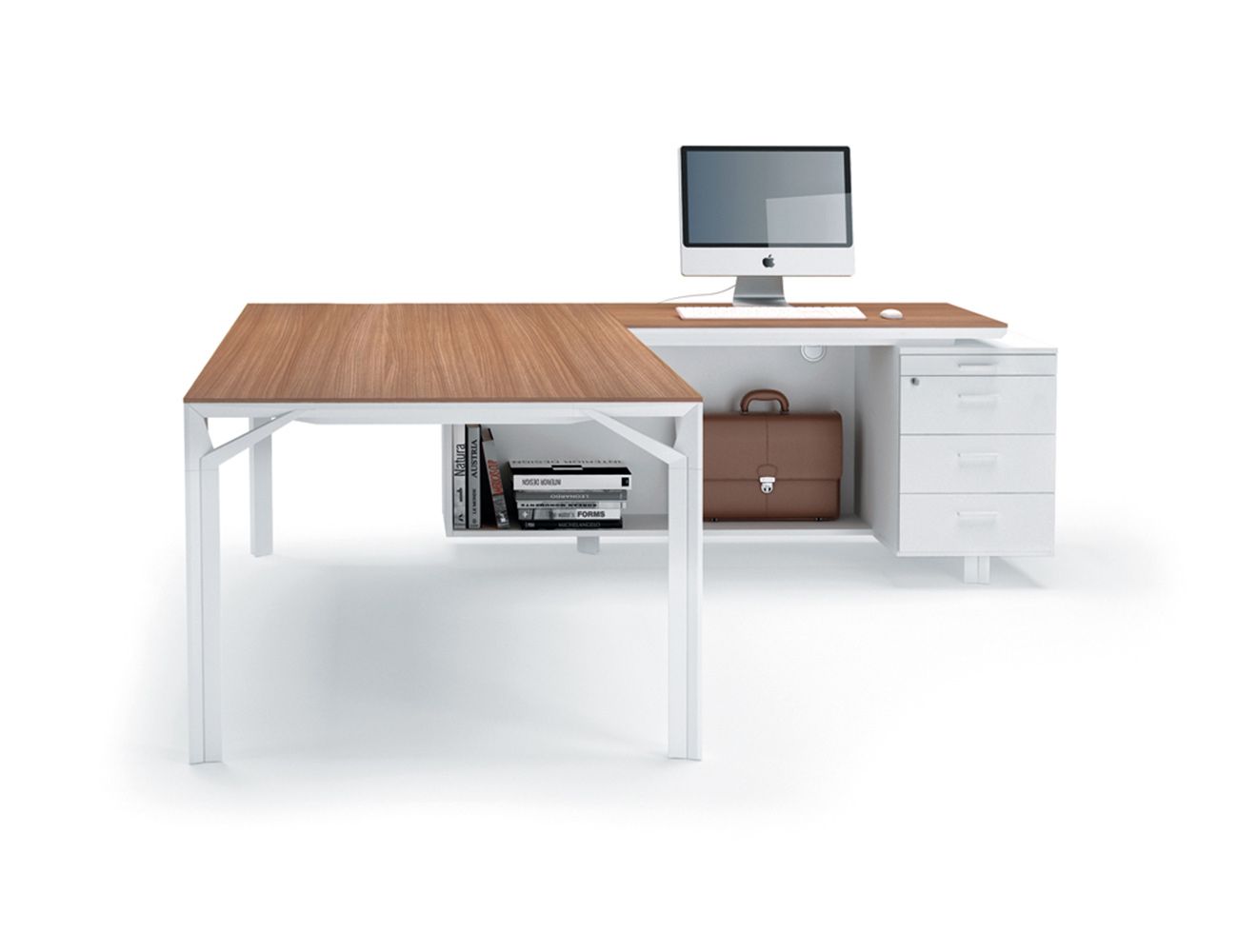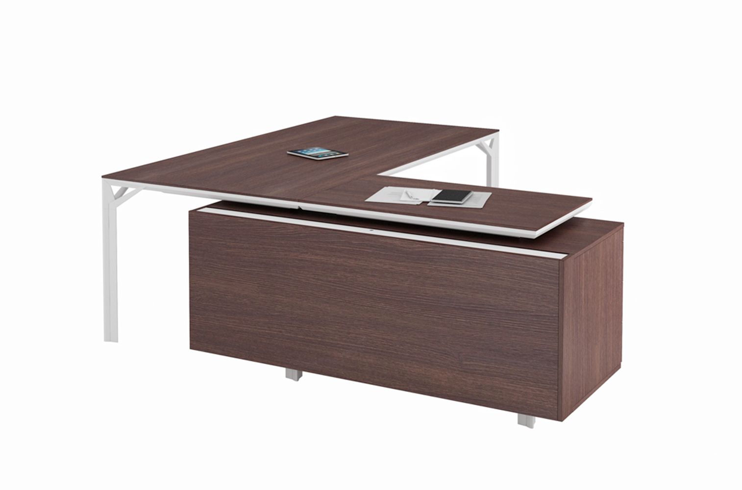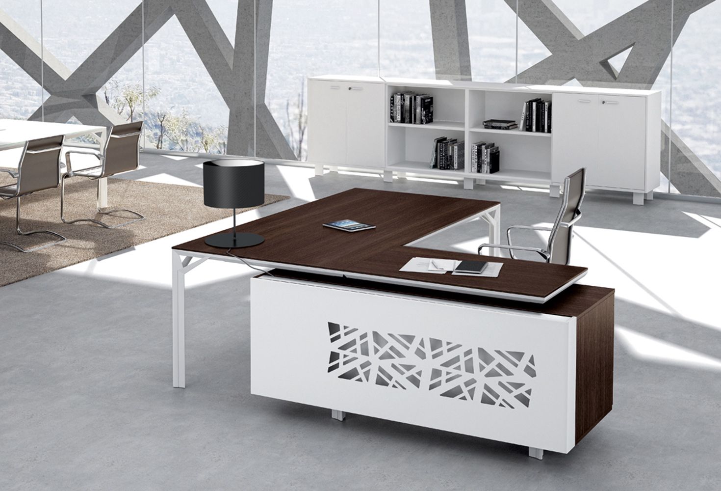 De exclusieve directie-lijn X8 van het Italiaanse Quadrifoglio, strak en puur design. Organisch vormgegeven frames in mat wit of mat donkergrijs (shadow grey) met 10mm dunne geprofileerde bladen van melamine, glas of gelakt hout.